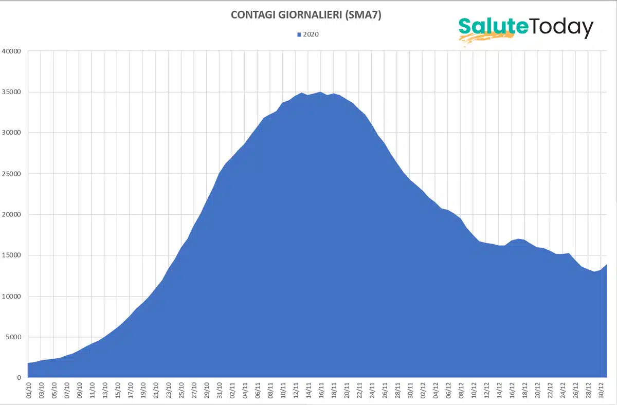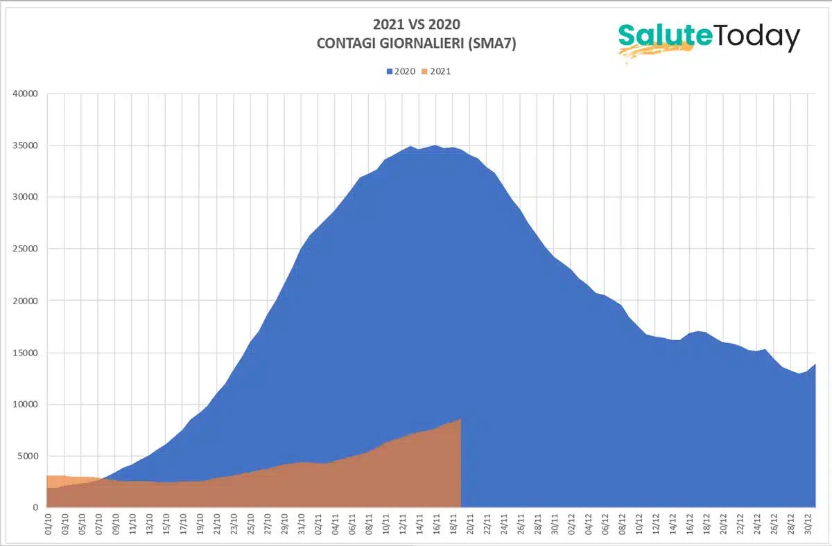 Covid-19: come vanno le cose rispetto all’anno scorso? La disamina settimanale di SaluteToday. Mettere a confronto i dati dello scorso anno con quelli di quest’anno ci aiuta ad avere un quadro piuttosto esaustivo di come la pandemia da Covid-19 continua, nel nostro Paese, a muovere i suoi passi. Sin qui abbiamo preso in esame il trimestre settembre-novembre, arco di tempo nel quale lo scorso anno abbiamo registrato la forte impennata dei contagi e, di conseguenza, dei ricoveri e dei decessi; impennata che, lo scorso anno appunto, si è evidenziata a partire dalla metà di ottobre. Da questa settimana, giunti ormai oltre la metà di novembre, sposteremo di un mese il nostro periodo di osservazione, e prenderemo dunque in esame il trimestre ottobre-dicembre, così da avere sott’occhio l’intero periodo in cui, nel 2020, abbiamo visto la curva prima impennarsi violentemente e poi tornare sui suoi passi. Partiamo dunque dall’esame dei dati relativi ai contagi giornalieri di ottobre-dicembre 2020. Cosa è successo lo scorso anno? Andiamolo a vedere nei dettagli utilizzando, come sempre, per il numero dei contagi giornalieri, la media mobile semplice a 7 giorni (SMA7).