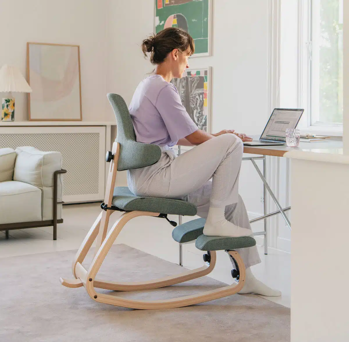 “D’altronde -gli fa eco Mandrini- le nostre gambe e i nostri piedi hanno la responsabilità primaria di farci muovere. Con la seduta tradizionale, i piedi sono spesso dimenticati, e siamo costretti a sederci a gambe incrociate o cercare freneticamente un posto adatto dove appoggiarli. Una sedia kneeling, invece, invita tutto il corpo a muoversi. La curvatura dei pattini in legno ci spinge a trovare e a mantenere l’equilibrio, e qualsiasi spostamento del peso o dei piedi ci metterà in movimento spostandoci in una nuova angolazione. Ciò fa sì che i piedi cambino posizione costantemente. Questo uso frequente e dinamico dei muscoli delle gambe facilita il flusso di sangue verso il cervello, cosa che influenza positivamente i livelli di energia, la capacità di concentrazione e il senso generale di benessere”.